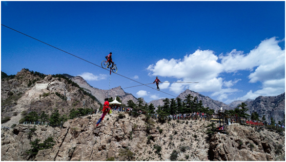 欣赏高空峡谷走钢丝表演