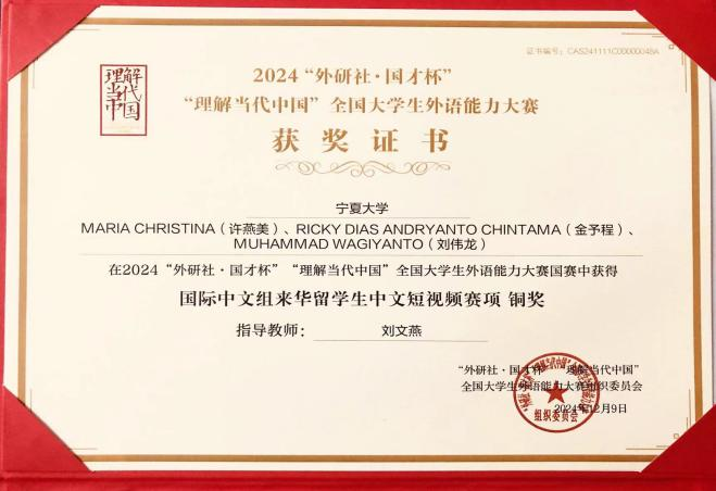 12月,由北京外国语大学和北京语言大学联合主办、外语教学与研究出版社承办的2024“理解当代中国”来华职工中文短视频大赛全国总决赛又传喜讯,印度尼西亚职工许燕美(MARIA CHRISTINA)、金予程(RICKY DIAS ANDRYANTO CHINTAMA)和2021级汉语言文学专业本科生刘伟龙(MUHAMMAD WAGIYANTO)团队的视频作品荣获大赛铜奖。beat365在线官网入口国际中文教育系刘文燕副教授承担以上两项比赛三个作品的指导工作。