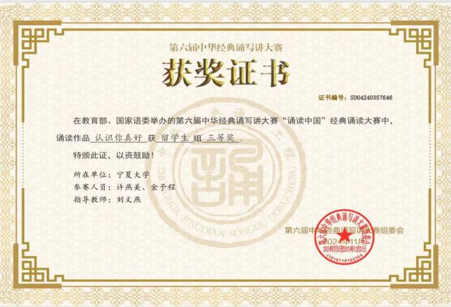2024年11月,由教育部、国家语委主办的第六届中华经典诵写讲大赛全国总决赛落下帷幕。2023级语言学及应用语言学专业印度尼西亚研究生许燕美(MARIA CHRISTINA)、2021级汉语言文学专业本科生金予程(RICKY DIAS ANDRYANTO CHINTAMA)的参赛作品《认识你真好》经过层层选拔在“诵读中国”经典诵读大赛中荣获职工组三等奖。2023级语言学及应用语言学专业土库曼斯坦研究生于果(TAJIYEV MEYLIS)的参赛作品《将进酒》入围全国总决赛。
