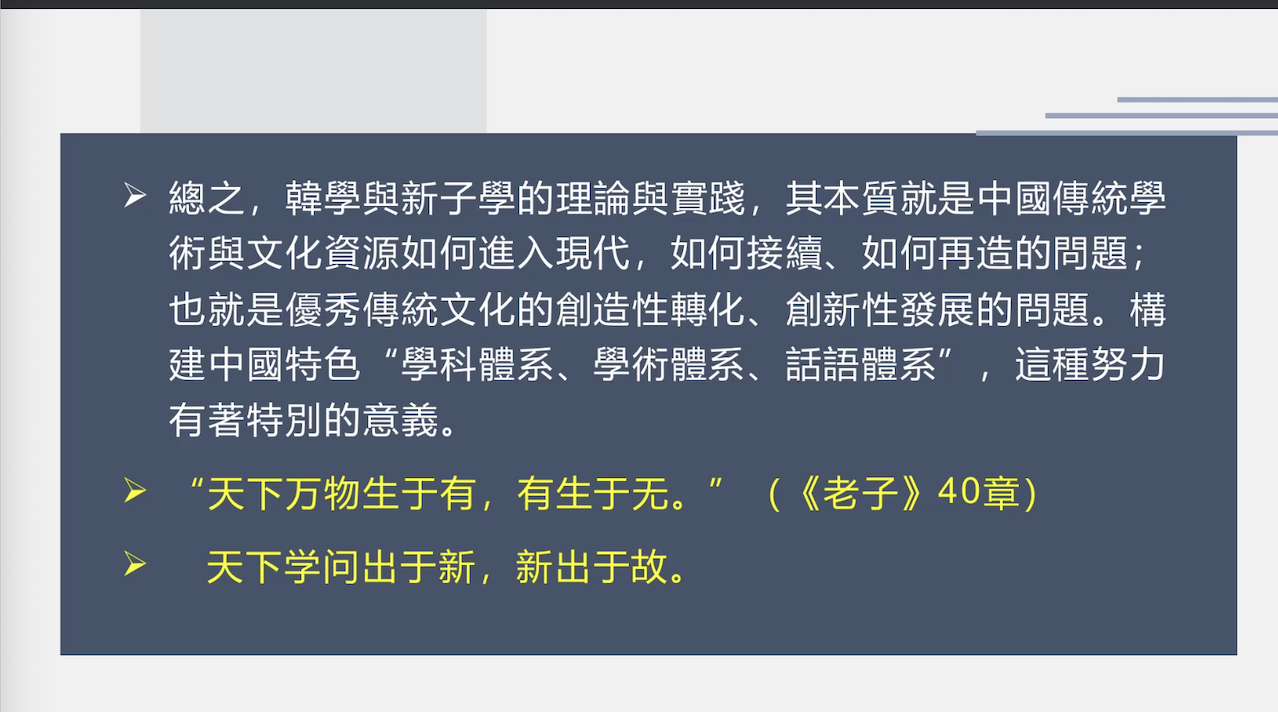 最后,马教授提出当代学者应从文献史、思想史、文学史、接受史四个维度出发构建韩学史。韩学与“新子学”的理论与实践,其本质就是中国传统学术与文化资源如何进入现代、如何接续、如何再造的问题,也就是传统文化的创造性转化、创新性发展的问题,这种努力也对构建中国特色学科体系、学术体系、话语体系有着特别的意义。同时,马教授对“新子学”与韩学进行了再思考,指出“新子学”是对晚清以来诸子学传统的赓续,也是对诸子学研究范式的不断推进,更是构建中国学术体系、话语体系的具体实践,并且“新子学”自身作为一个开放、多元的学术系统,其研究亦终将回归诸子学史的研究传统。马老师以“天下学问出于新,新出于故”一句结束本次讲座,之后与部分同学做了交流讨论。