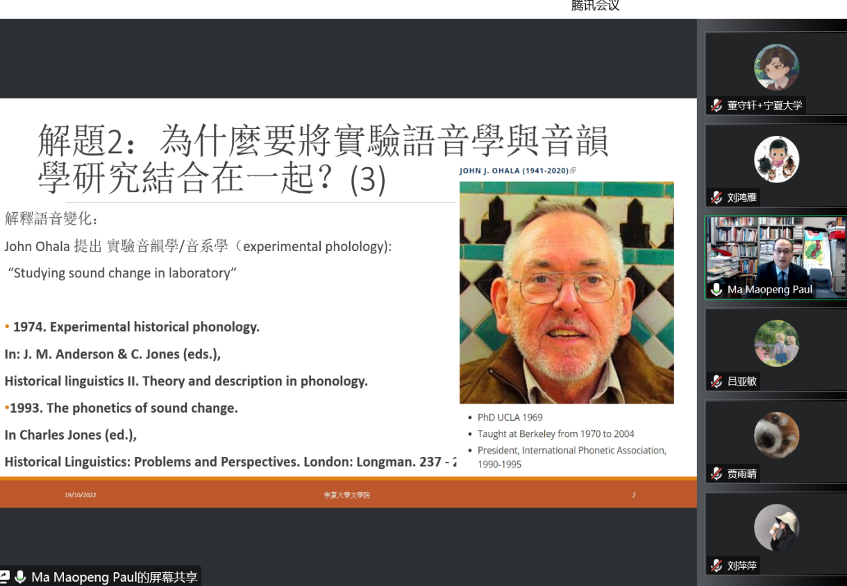 10月19日下午,beat365在线官网入口于腾讯会议平台举行了题为“实验语音学与音韵学研究”的学术讲座。本次讲座特邀香港岭南大学中国语文教学与测试中心高级讲师,陕西师范大学语言科学研究所兼职教授马毛朋博士主讲。讲座由beat365在线官网入口副经理刘鸿雁主持,汉语言文字学学位点、语言学及应用语言学学位点全体研究生参加本次线上讲座。