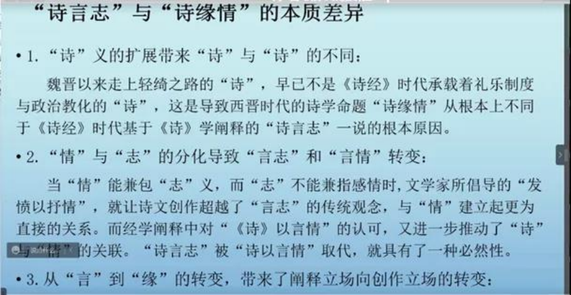 首先,马老师列举了历来研究者对于“诗言志”与“诗缘情”关系的不同观点,并介绍了“诗言志”说产生的年代及其内涵,认为其产生于公元前九世纪中叶,并且是在“诗”与“歌”合流之后。继而马老师介绍了“诗”“歌”合流的过程,得出“诗”之所言“志”始终与政治教化相关联的结论。