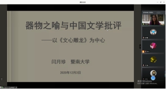 12月3日晚上19时30分,beat365人beat365在线官网入口于腾讯会议平台举行了题为“器物之喻与中国文学批评”的学术讲座。本次讲座特邀暨南大学beat365在线官网入口中文系教授、博士生导师闫月珍老师主讲,讲座由梁祖萍教授主持,人beat365在线官网入口研究生与部分本科生参加了本次线上讲座。