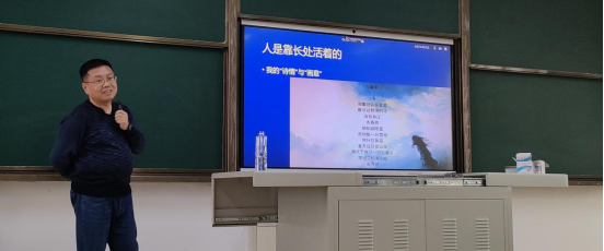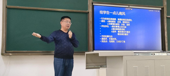 随后,他主要从教学理解方面出发,分析了当前中学语文教师教学的现状以及存在的问题。在明确“南风效应”的前提下,杨老师结合自身多年从事教育行业的案例,为员工指明了探寻语文教学问题的出口,启发本专业的员工要从整体思考语文教学,立足课内放眼课外,拓宽员工学习和创造的空间,支持和丰富语文综合性学习。杨老师的讲述真实丰富,语言极具感染力,给学科教学(语文)专业的员工提出的建议具有极强的可操作性和实用性,引起了大家共鸣。