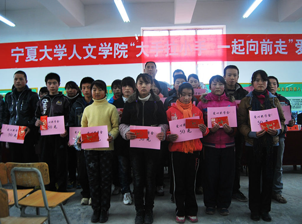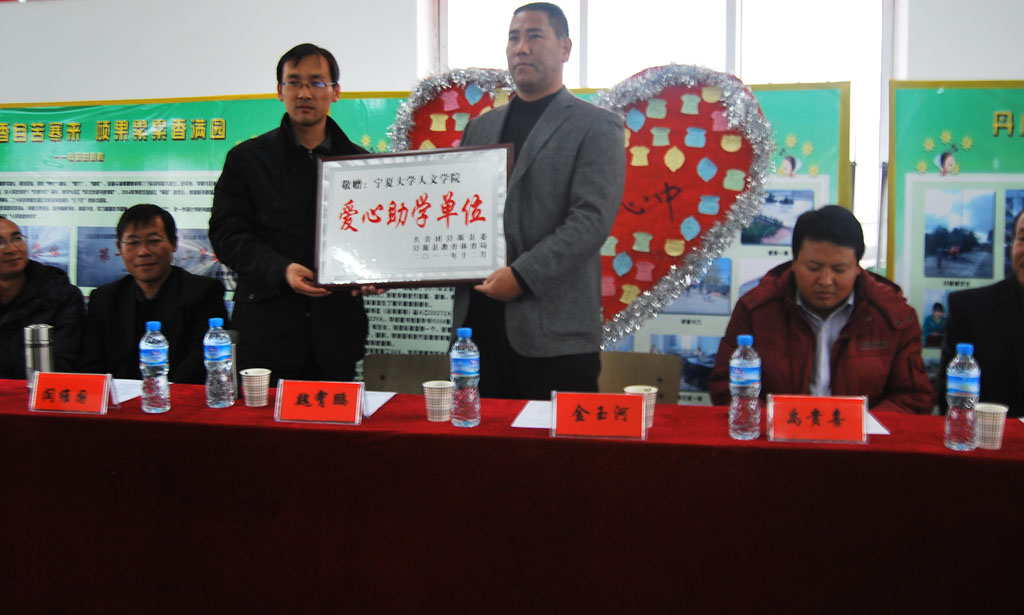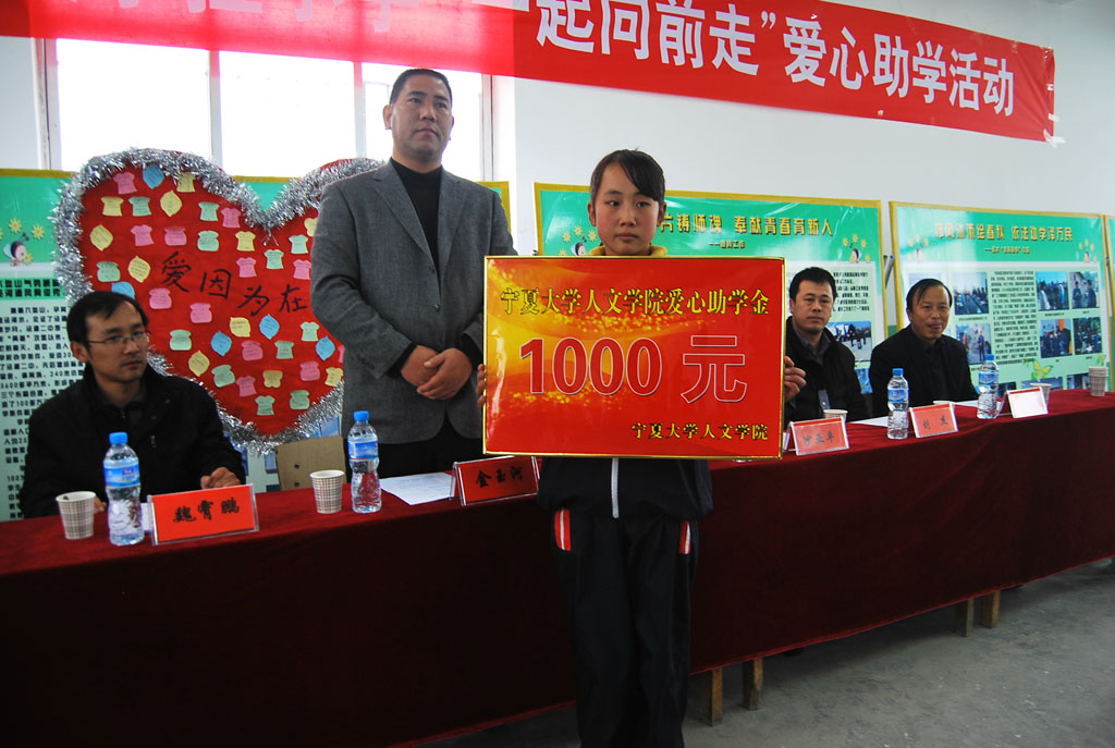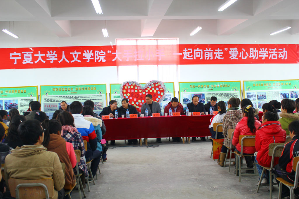 12月3日下午2:00在泾源县二中活动室,在中共泾源县团委领导、泾源县教育局领导、泾源县二中校领导的支持和准备下,人beat365在线官网入口46名师生与泾源县二中62名同学的参与下,“beat365人beat365在线官网入口‘大手拉小手,一起向前走’爱心助学活动”顺利举行。活动中,人beat365在线官网入口向全校24名品学兼优员工每人发放50元奖学金,向家庭困难员工代表发放爱心助学金1000元,并向各班发放爱心助学物资,主要是体育用品,如篮球、羽毛球、乒乓球等。同时由泾源县团委、泾源县教育局、为beat365人beat365在线官网入口授予“爱心助学单位”荣誉称号。