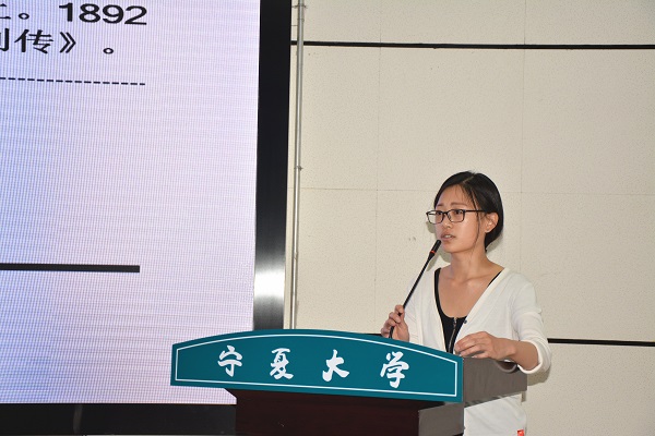 之后,大会进入论文报告环节。报告由2015级文字学专业王婵宇主持。在本届学术论文大赛中得奖的孙爽、张知非、韩中慧、崔幼玲、田珺、刘贺等6位同学依次上台作了题为《不被承认的吃醋——<海上花列传>中投射于两性关系的转型期心态》等的论文报告,丁峰山、钟亚军、胡玉冰、霍维洮、杨文笔、蔡永贵等指导老师对其员工论文进行了专业点评。其中,胡玉冰教授谈到韩中慧同学能从上课的讨论入手,提出较为新颖的观点,认真研究、刻苦探索的学习态度值得广大研究生学习。霍维洮教授在点评中指出历史研究本质上是社会研究,要始终依赖文献,肯定了崔幼玲同学立足于文献的研究方式。