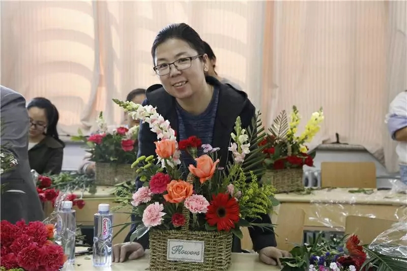 戚建筠首先介绍了中国传统插花讲究自然美、线条美甚至是想象的意境美,茶席插花讲究素雅、小巧、精细,其中蕴含着清雅的禅意。她说插花不仅是一门设计的艺术,在追求高超技艺的同时,也应注重插花过程中的礼仪,例如在插花过程中需注意保持桌面整洁,花篮干净,插花完成后应不留垃圾,营造艺术的美感氛围。其次,她通过康乃馨、勿忘我、玫瑰等花向大家阐明如何修剪花枝,整理花材,她强调修剪枝条应达到虽由人做、宛自天开的境界。花与容器的结合,虽注重整体美,但也应有花的尊严和状态,彼此适当的协调才是最完美的。最后,她让大家自由发挥,随意想象,随心而走。大家可从颜色、结构、造型等方面构造出自己心目中的花型,从高度、宽度与厚度方面考虑如何着手。同时,插花需要思考主花、副花和补花的适当搭配与巧妙结合。在插花的过程中,大家热情高涨,积极与戚建筠谈论插花知识及技巧。