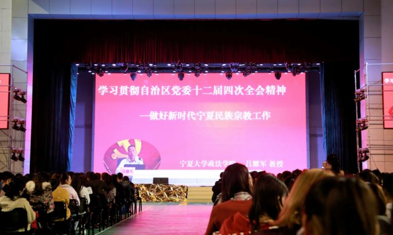 吕耀军教授用一个半小时的时间为各位师生解读了自治区党委十二届四次全会精神,比较全面详细的介绍了当前我国、我区民族宗教的现状、存在的问题及解决的方法,使与会师生开阔了眼界,增长了见识,为牢固树立马克思主义民族观、宗教观,准确把握党的民族宗教理论和方针政策起到了很好的指导作用。金玉河副书记在总结中要求与会师生在今后的工作、学习、生活中,一定要准确把握党的民族宗教理论和方针政策,自觉做民族团结进步的践行者和推动者。