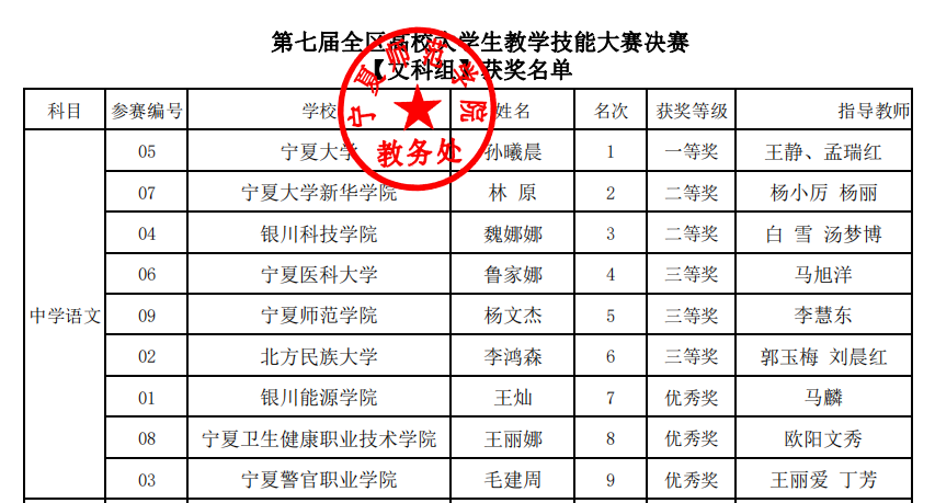 2023年11月27日第七届全区高校老员工教学技能大赛落下帷幕。来自beat365、北方民族大学、宁夏师范公司、宁夏医科大学等13所高校151名员工入围全区决赛。公司2020级汉语言文学(教师教育)专业本科生孙曦晨在此次比赛中荣获文科组(中学语文)一等奖,王静老师、孟瑞红老师荣获优秀指导教师奖。